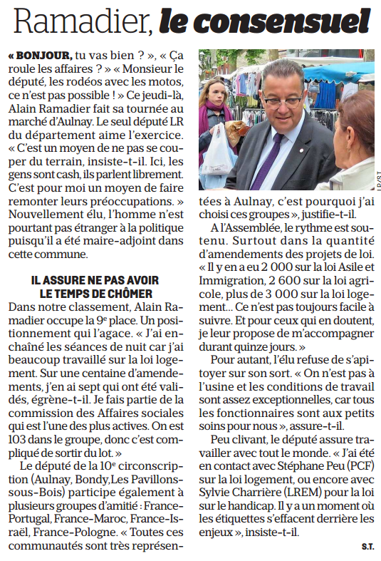 Le journal Le Parisien publie aujourd’hui un article consacré aux députés du 93. Un zoom particulier est effectué sur Alain Ramadier qui représente Aulnay-sous-Bois, Bondy et Les Pavillons-sous-Bois à l’Assemblée nationale.